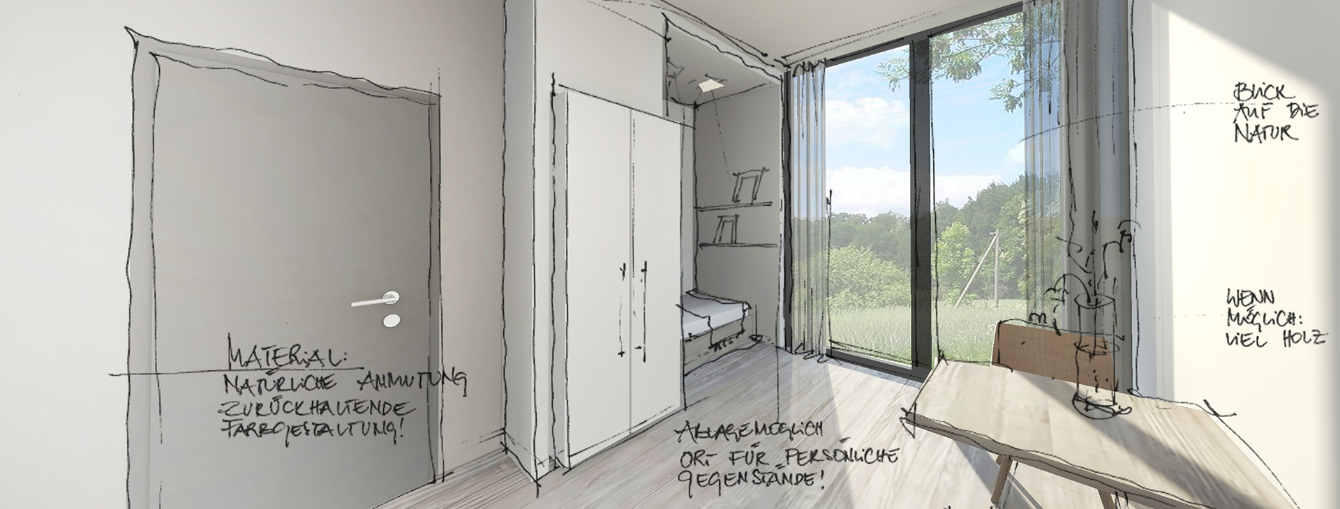 Das Materialkonzept leiten wir zunächst aus den praktisch erforderlichen Ansprüchen an Hygiene, Brandschutz, Akustik, Ökonomie und Ressourcenverbrauch ab. Die Beschaffenheit, Haptik und Farbigkeit der Materialien prägen die sinnliche und atmosphärische Erfahrung der Räume durch ihre Nutzer. Die Funktion der Räume kann durch ihre Gestaltung unterstützt und sichtbar gemacht oder auch kaschiert werden. Im Zuge des Farb- und Materialkonzeptes werden alle Bauteile betrachtet - Boden, Wand, Decke, Türen, eingebaute und lose Möbel sowie Textilien und Beleuchtung. Ziel ist ein stimmiges Gesamtbild zu entwickeln unter Einbezug aller vorher genannten Anforderungen.