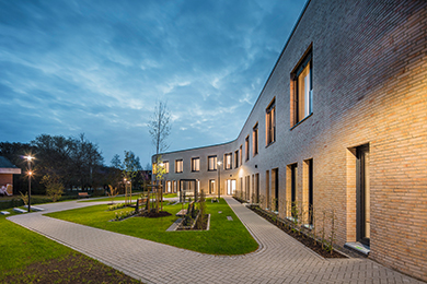 Der Neubau der Fachklinik nimmt die zentralen städtebaulichen Achsen der angrenzenden Gebäude auf dem Klinikgelände auf und folgt der geschwungenen Linie der Norderbäke. Dadurch erhält der Baukörper seine charakteristisch fließende Struktur und verschmilzt zu einem einzigartigen Gebäudekubus. Die bereits vorhandenen Gebäude auf dem Klinikgelände bestehen aus rotem Sichtmauerwerk. Der Neubau nimmt das vorhandene Material „Ziegel" auf, setzt sich aber durch seine helle Sandsteinfarbe von den vorhandenen Klinikgebäuden ab.
