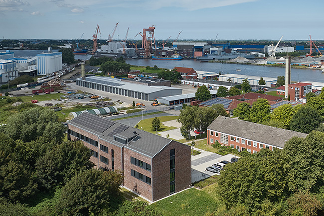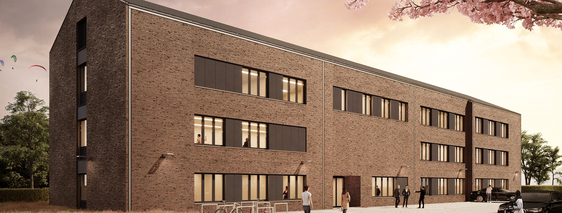 Der Neubau des Büro- und Verwaltungsgebäudes verbindet moderne Architektur und funktionale Klarheit. Die kompakte, dreigeschossige Gebäudestruktur mit Satteldach ohne Überstand orientiert sich an dem traditionellen Bestand der Umgebung und überführt dessen Merkmale in eine zeitgemäße Formensprache. Durch die Fassade mit dem charakteristischen dunkelroten Wittmunder Klinker erhält der Baukörper eine markante und zeitlose Ausstrahlung. Großzügige Fensterflächen sorgen für eine helle und freundliche Arbeitsumgebung.