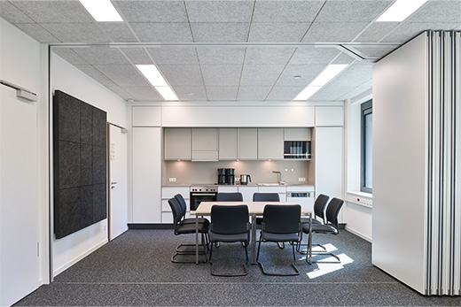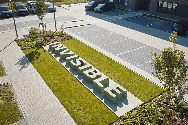 Im Außenbereich sorgen Sitzbänke, neu gepflanzte Bäume, Sträucher und Blumenflächen für Aufenthaltsqualität und einen einladenden Ankunftsbereich. Es sind Fahrradstellplätze für Mitarbeitende und Besuchende und zwei E-Ladestationen vorhanden. Eine Skulptur der Künstlerin Monika Goetz aus neun Buchstaben und einer Bodenplatte formt das Wort „INVISIBLE“. Der Titel steht in scharfem Kontrast zur Materialität – massiver, bewehrter Beton. Der Versuch, Unsichtbarkeit zu verkörpern, wirkt zum Scheitern verurteilt und beinahe absurd.