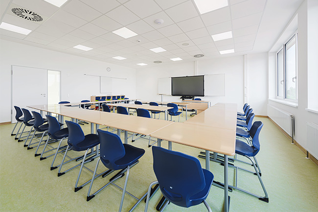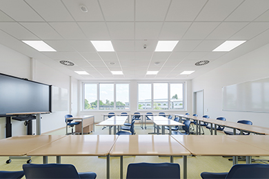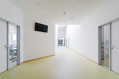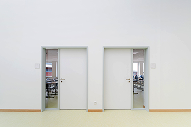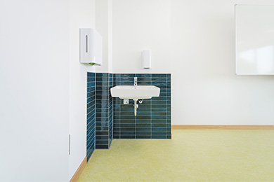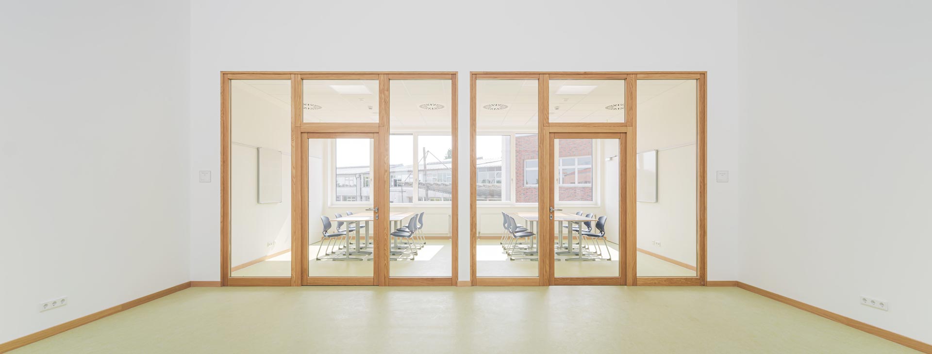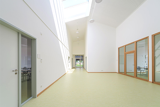 Im Gebäudeinneren erwarten die Nutzenden helle und einladende Räume mit feinen Oberflächenstrukturen und natürlichen Materialien, wie Eichenholz. Die Differenzierungsräume sind durch raumhohe Glastrennwände vom Flur abgetrennt und bieten sowohl Transparenz als auch Rückzugsmöglichkeiten. Akustisch wirksame, abgehängte Trockenbaudecken sorgen in den Unterrichtsräumen für eine angenehme Geräuschkulisse. Lichtbänder und aufgeweitete Bereiche lockern die langen Flure auf. Es entstehen hochwertige Aufenthalts- und Kommunikationsbereiche. Die Sanitäranlagen mit Fliesen in frischen, blaugrünen Tönen präsentieren sich modern und angenehm.
