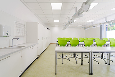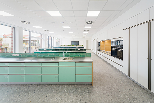 In der Lehrküche im Erdgeschoss finden sich hochmoderne Kücheninseln, ausgestattet mit professionellen Kochstellen, Doppelspülbecken und durchdachten Stauraumlösungen. Jede Küchenzeile hat eine Leitfarbe, die die Zuordnung für Schülerinnen und Schüler und die Lehrenden erleichtert. Für Schülerinnen und Schüler mit Behinderung ist eine Küchenzeile mit einem motorisch höhenverstellbaren Element ausgestattet, das neben der Arbeitsfläche einen Herd und eine Spüle beinhaltet. Der offene Unterrichts- und Speisebereich mit Smartboard fördert die Gemeinschaft und kann bis zu 17 Personen, inklusive Rollstuhlfahrenden, Platz bieten. Bei gutem Wetter kann das Essen in den Außenbereich verlegt werden.